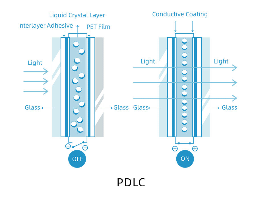 Zonder elektrisch veld is de PDLC smart film in een ondoorzichtige toestand. Wanneer er wisselstroom wordt aangelegd, rangschikken de vloeibare kristalmoleculen zich geordend, waardoor de film verandert van een ondoorzichtige (OFF) naar een transparante (ON) toestand.